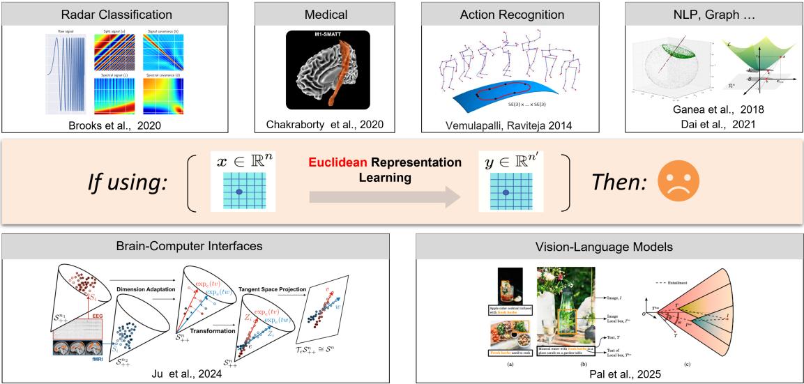 图1:在骨架行为识别、生物电信号(EEG、ECG等)解码、图像集分类、节点分类、医学图像分割等科学和工程领域,数据往往呈现出高维空间中所嵌入的低维流形结构。相较于传统的欧氏方法,黎曼深度学习能够在尊重数据内在几何结构的前提下,实现更为合理的建模、